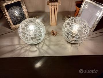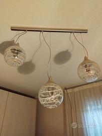 Lampadario e lampade da tavolo in vetro decorato e acciaio. Il supporto per il lampadario misura cm. 85. Il diametro delle lampade cm.20