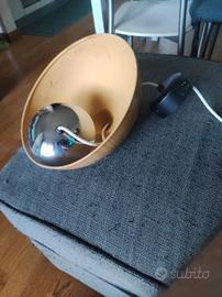lampadario metallico con motivo legno. diametro 26 cm, altezza della copertura 13 cm circa. perfettamente funzionante (una volta allacciato)
