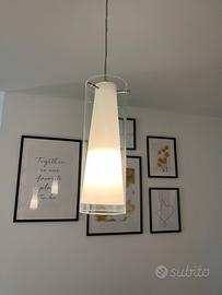 Composto da 3 punti luce con struttura in acciaio e paralumi in vetro bianco con cilindro esterno trasparente.