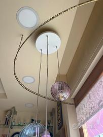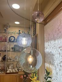 Lampadario a sospensione FabGlass composto da tre diffusori sferici in vetro soffiato di dimensioni e finiture differenti. La composizione include: una sfera piccola (Ø 16 cm) rosa con lavorazione cannettata, una sfera media (Ø 20 cm) azzurra con lavorazione cannettata e una sfera grande (Ø 25 cm) verde con finitura liscia.