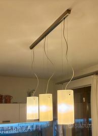 Misura barra acciaio satinato 1 mt , misura copertura lampadine in vetro satinato h 27cm l 12cm, completo di 3 lampadine E27 3000K, l’altezza totale del lampadario può variare in base alle esigenze tramite lo scorrimento dei cavetti in acciaio che reggono il vetro. Tenuto benissimo.