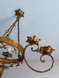 Lampadario in ferro battuto, realizzato a mano ,con finitura dorata e decorazioni a forma di foglie. E’ un tipo di candelabro o chandelier antico in stile Classico/Barocco, adatto ad ambienti arredati con gusto tradizionale o eclettico. Presenta bracci curvi che terminano con portalampada a forma di piattino decorato a foglia.Misure h 78 x L 65