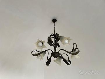 LAMPADARIO FERRO BATTUTTO.FOGLIE E 5 FIORI VETRO