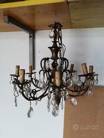 Lampadario in ferro e gocce di vetro da 8 luci da restaurare: impianto elettrico da sistemare e mancano alcune gocce.