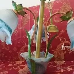 Lampadario in ferro lavorato, decoro con foglioline e fiori in vetro azzurrino e bianco. Altezza totale 68 cm. Ritiro/ Consegna Praia a Mare (CS). Non e' possibile la spedizione