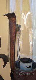 Lampadario antico fiorentino in ferro tipo battuto a tre luci, disposte a triangolo, completo e funzionante. Luci inglobate in cilindri di vetro in perfetto stato di conservazione. Altezza cm.100, larghezza lato triangolo cm.60