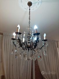 Lampadario in ottone e cristalli, con particolari di pregio.