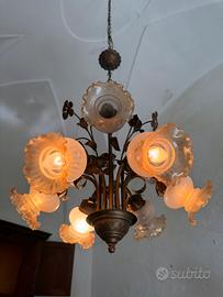 Elegante lampadario anni ’70 in metallo color oro con decorazioni floreali in vetro.