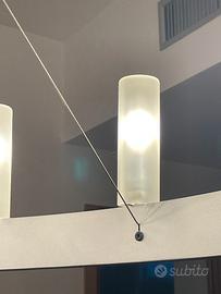 Materiali: Struttura ad anello in metallo verniciato grigio e diffusori cilindrici in vetro borosilicato sabbiato.