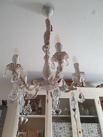 Vendo lampadario a cinque bracci in perfetto stile " shabby chic" di provenienza dalla MAISON du Mond con struttura in ferro e legno mentre le gocce appese sono in vetro sintetico, completo di 5 lampadine a led da 5w di potenza cad. una