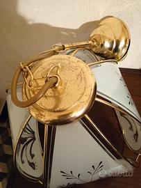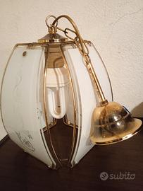 Lampadario in vetro con decori e profili in ottone.Le condizioni sono buonissime,ha solo un po' di ossidazione del metallo che può essere sistemata con un prodotto specifico,ma che comunque si noterebbe poco una volta appeso.