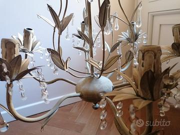 Lampadario 6 braccie, di metallo verniciato colore verde/grigio/beige pallido, con foglie e varie decorazioni in vetro (alcuni mancanti). 51 cm in altezza, 53 cm diametro. Elettrico perfetto.