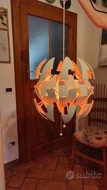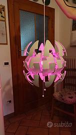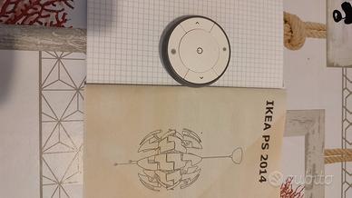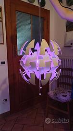 Lampadario IKEA PS2014 + lampadina smart tradfri. Completa di telecomando e apposita lampadina che tramite telecomando se ne può cambiare colore e intensità. Colori dal bianco freddo, bianco caldo, fino al viola. Tramite telecomando la lampada si può anche accendere o spegnere. Lampadario bianco sia esternamente che internamente.