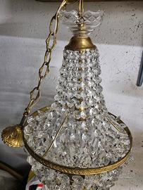 In ottone e cristalli, con decorazioni alla greca. Originale anni 50-60, stile mongolfiera. Molto elegante, diametro 40 cm, altezza circa 60 cm. Con un punto luce a passo grande, impianto da verificare in base alle norme vigenti. Imballo sicuro con polistirolo e pluriball, fornisco anche un sacchetto di gemme per eventuale ricambio.