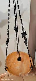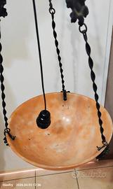 Lampadario in alabastro caratterizzato da una coppa in pietra naturale lavorata e catena in ferro battuto lavorato con decorazione floreale. Misure: diametro 36 cm altezza 13 cm