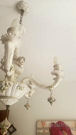 Lampadario a 6 braccia in ceramica con decorazioni floreali e putti, anni '70, lavorazione artigianale di Bassano del Grappa. Stato di conservazione più che buono, completo in tutte le sue parti. Insieme regalo piccolo vasetto coordinato di circa 20 cm di altezza e piccolo portagioie con coperchietto fessurato e incollato, causa rottura. Non effettuo spedizione in quanto troppo delicato.