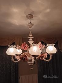 Vendo Lampadario in ceramica di Bassano con decorazione dorata. altezza 1m larghezza 90 cm.