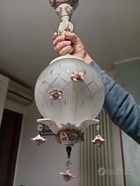 lampadario anni 70 con rosone coprifilo, stelo,rosone finale e roselline in ceramica di bassano. Sfera in cristallo satinato con alcune roselline attaccate. Alcune si sono staccate ma recuperate. Sono da incollare sulla sfera