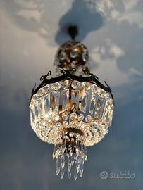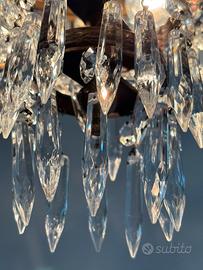 Elegante lampadario in stile classico, realizzato in ottone lavorato e decorato con pendenti in cristallo sfaccettato che diffondono la luce creando splendidi riflessi.