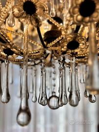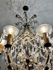 Lampadario in acciaio brunito scuro e cristallo a goccia, in stile Maria Teresa con N.6 portalampade a candela e N.2 applique con 3 portacandela ciascuno.