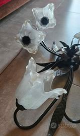Lampadario In Ferro Battuto A 6 Paralumi In Vetro A Fiore Stile Valastrto.