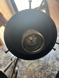 Elegante lampadario in ferro battuto, lavorato con motivi decorativi e inserti in vetro colorato (verde, blu, viola, giallo). Pezzo particolare, ideale per dare carattere a ingresso, soggiorno o taverna. Struttura solida, completo di globo in vetro lavorato.