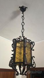 telaio in ferro battuto lavorato a mano, con eleganti volute e decori a ricciolo che incorniciano il corpo centrale. Pannelli in vetro cattedrale/rullato color ambra con motivo a cerchi concentrici ("occhio di bue"). Questa particolare texture crea una luce calda, soffusa e molto accogliente. Design che richiama le lanterne medievali, ideale per ingressi, taverne, studi o ambienti arredati in stile vintage/retrò. senza catena lungo 40 cm