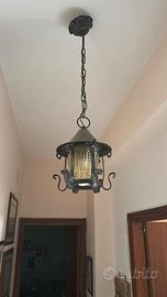 Solida lavorazione in ferro battuto nero/brunito, con eleganti riccioli e volute decorative che circondano e proteggono il diffusore in vetro. Il rosone a soffitto è anch'esso in ferro lavorato.Diffusore centrale in vetro soffiato/rullato color ambra, con una particolare forma bombata e scanalata che ricorda una lanterna antica