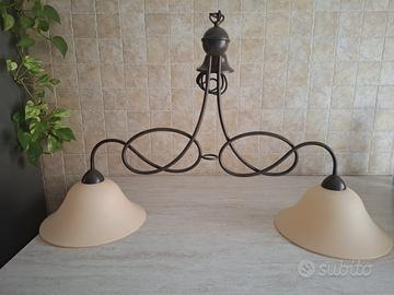 Lampadario classico in ferro battuto, 2 luci, struttura in ferro battuto color marrone scuro, diffusori in vetro color sabbia. Usato pochissimo senza nessun graffio come nuovo.