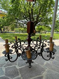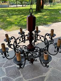 Lampadario a otto luci E14 in ferro battuto e legno.