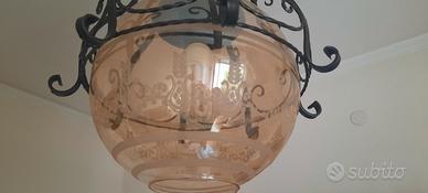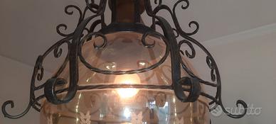 Lampadario anni '80 in ferro battuto tronchetto in legno lavorato e boccia in vetro fumé con lavorazioni in pasta di vetro. Completo di catena per appendere al soffitto.