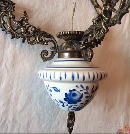 Lampadario in ferro battuto con un porta lampada e una copertura in vetro smerigliato decorato, e una decorazione in ceramica in fondo.