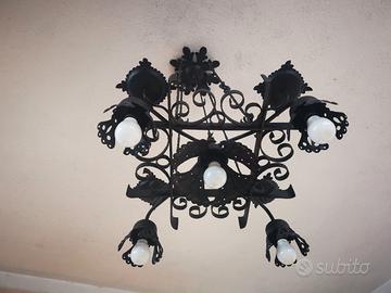 Lampadario rustico in ferro battuto anni '70, nero lucido originale, sapientemente forgiato a mano.