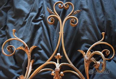 Si tratta di un ferro tornito a mano con foglie sbalzate ed elementi di raccordo per candele. Il ferro può essere mantenuto così o montato a lampadario.
