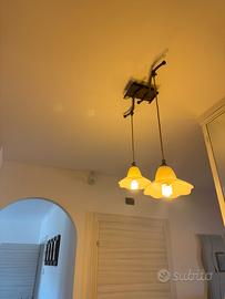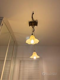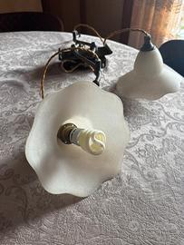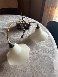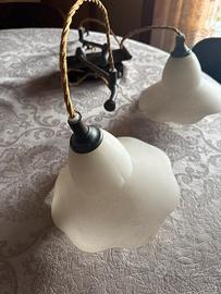 Lampadario in ferro stile toscano con due campane in vetro satinato. Perfettamente funzionante e con attacco lampade a led