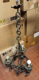 Lampadario in ferro in ottime condizioni, lungo 105 cm; diametro del cerchio di ferro 30 cm. La distanza tra i portalampade è circa 42 cm e ognuno di essi sporge 10 cm dalla circonferenza. Prezzo trattabile