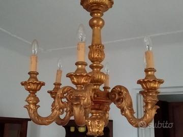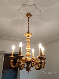 Lampadario vintage in legno intagliato e dorato, di grande impatto estetico, per gli amanti dello stile classico/vintage. E' in buone condizioni, dimensioni larghezza 61cm, altezza 66cm (esclusa catena)