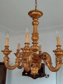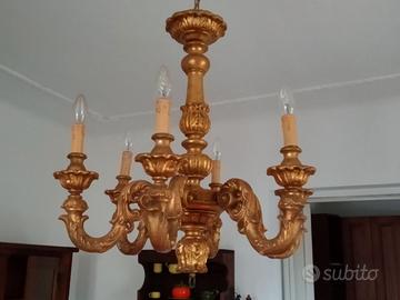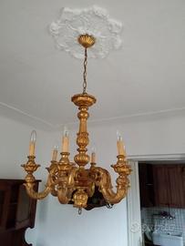 Lampadario vintage in legno intagliato e dorato, di grande impatto estetico, per gli amanti dello stile classico/vintage. E' in buone condizioni, dimensioni larghezza 61cm, altezza 66cm (esclusa catena)