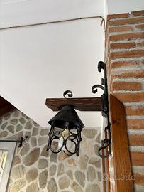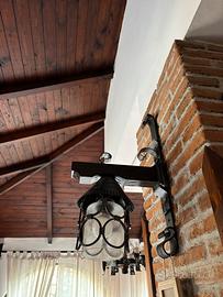 Lampadario a ruota in legno e ferro in buono stato ,due applique una senza vetro