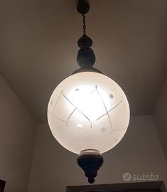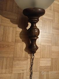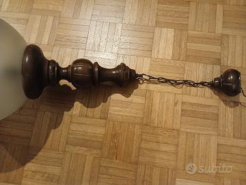 Vendo lampadario classico, caratterizzato da un grande globo in vetro soffiato opale/satinato con decorazioni a reticolo/griglia e tutto il corpo è completamente in legno spesso tornito, la parte superiore si collega alla catena di sospensione. E' in ottimo stato, pari al nuovo (come si può vedere da foto).Diametro globo di circa cm.94, alto circa cm.76 senza catena di sospensione, solo la catena di sospensione+attacco sopra in legno e' di circa cm.29. La catena si può accorciare a piacimento in modo modo semplice,basta sganciare e togliere il numero di anelli desiderati. Compreso di lampadina comprata a gennaio. Funziona benissimo e Illumina molto. Lo vendo ad euro 25. Gia' tirato giù. Ritiro a carico dell'acquirente.