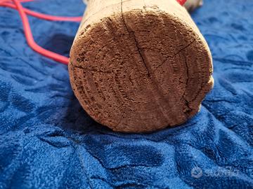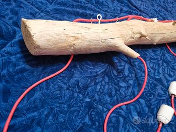 Il lampadario completamente realizzato a mano partendo da un pezzo di legno grezzo. E' stato predisposto per 4 luci con portalampada bianco e cavo di collegamento rosso telato. I bracci delle singole lampade vanno da 75cm a 50 cm, mentre la lunghezza complessiva è di 90 cm.