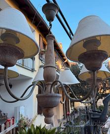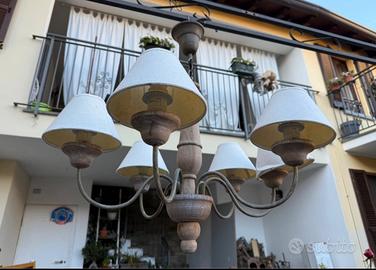 Lampadario 6 luci in legno stile shabby chic. 2 paralume sono da cambiare.