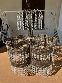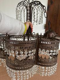 Elegante lampadario realizzato in ottone lavorato con ricca decorazione a pendenti in cristallo sfaccettato. La struttura presenta una raffinata lavorazione traforata con motivi ornamentali, arricchita da numerose gocce e perline in cristallo che riflettono la luce creando un suggestivo effetto luminoso.