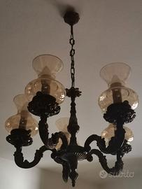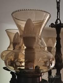 Elegante lampadario in metallo brunito dotato di 5 coppe di vetro trasparente lavorato, adatto ad una sala o ad una camera da letto.
