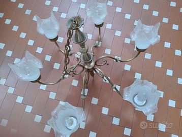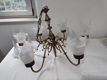 Vendo elegante lampadario in stile classico, a 6 bracci, struttura in ottone con finiture lavorate e coppe in vetro satinato a forma di fiore, complete e integre.