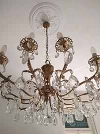 Lampadario in ottone con 12 braccia e gocce di vetro