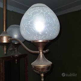 Ciascun braccio termina con con un portalampada che ricorda una lampada ad olio, sormontata da una boccia in vetro opalescente lavorato.