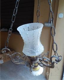 Lampadario in Ottone, Ceramica e Vetro Stile Liberty tipico del Vintage anni '50, '60 o '70. Design e Materiali: Il lampadario presenta una struttura in ottone con decorazioni floreali, un paralume in vetro opacizzato a forma di vaso e inserti in ceramica decorata. Sistema di Sospensione: È sostenuto da tre catene che convergono verso una base per il fissaggio a soffitto. Esattamente ciò che si vede in foto. Ritiro gratuito a Foggia, San Severo, San Giovanni Rotondo o Cerignola. SE LEGGI L'ANNUNCIO, VUOL DIRE CHE L'OGGETTO E' DISPONIBILE.
