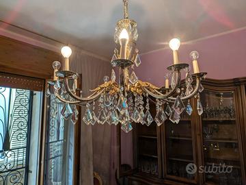 Elegante lampadario a, realizzato in ottone lavorato e decorato con gocce in cristallo che creano piacevoli giochi di luce. A perfettamente funzionante.