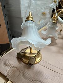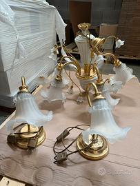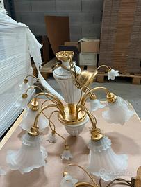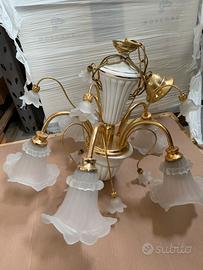 Vendo lampadario a sospensione in stile classico, con struttura in metallo dorato (effetto ottone) e diffusori in vetro satinato lavorato a forma di fiore. Composto da più punti luce, ideale per soggiorno, sala da pranzo o camera. Il lampadario è in buone condizioni generali, come da foto. Design elegante e decorativo tutto insieme prezzo trattabile